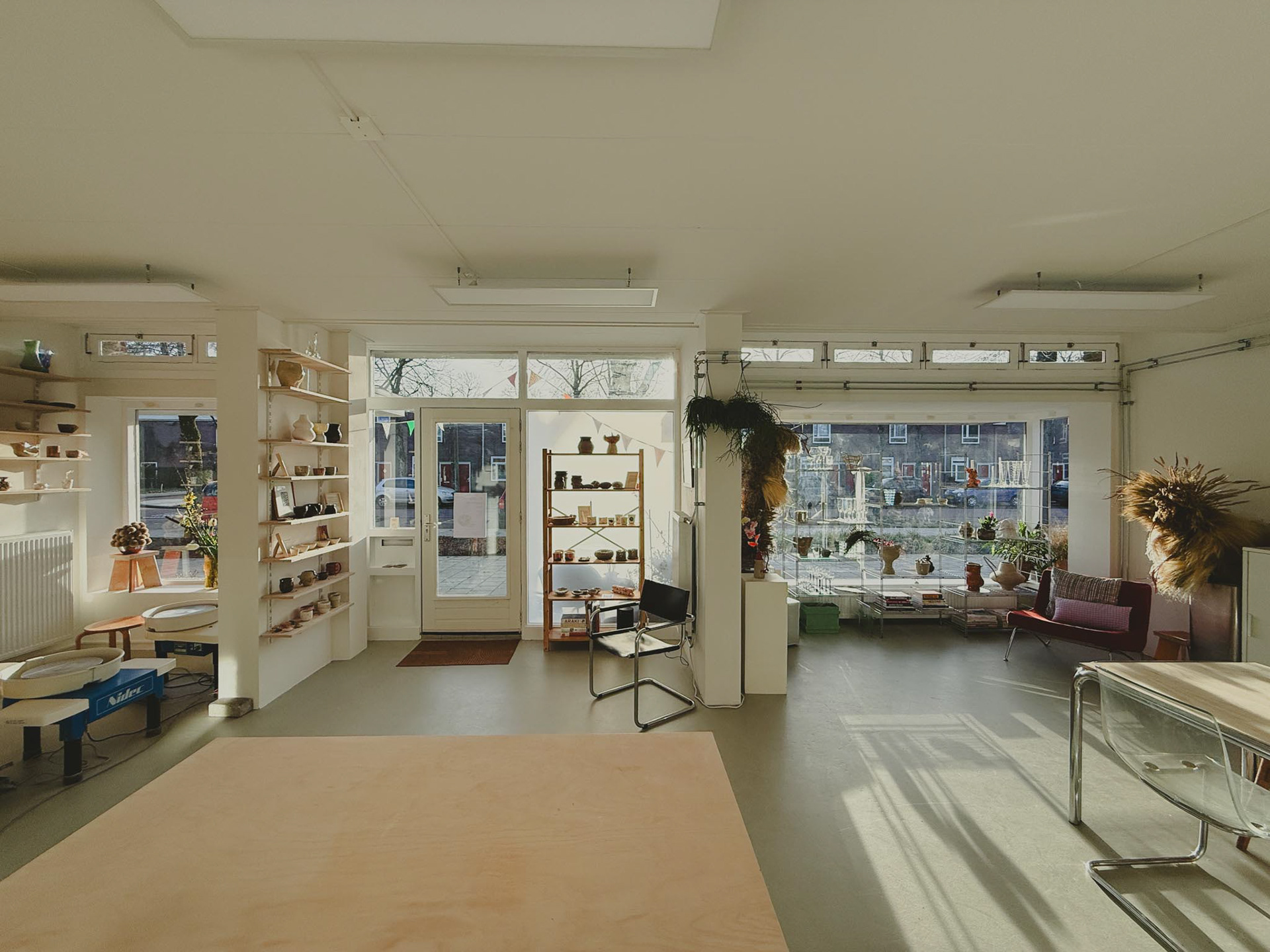 it's a 50m2 space equipped with two working tables (more available), three throwing wheels, kitchen and toilet, with daylight and public parking in front of the studio.